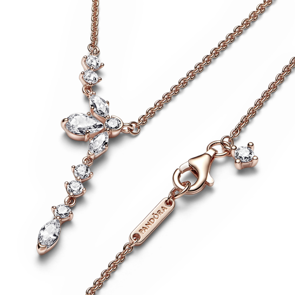 Bring the beauty of nature to your jewellery with our Sparkling Herbarium Cluster Drop Collier Necklace. This statement design features gracefully tumbling stones that fall from a central cluster of round, pear-shaped and marquise-cut cubic zirconia, forming a geometric shape inspired by petal and leaf elements. An elegant reinterpretation of the shapes we find in nature, this 14k rose gold-plated necklace is perfect for bringing a touch of the natural world to your everyday looks.